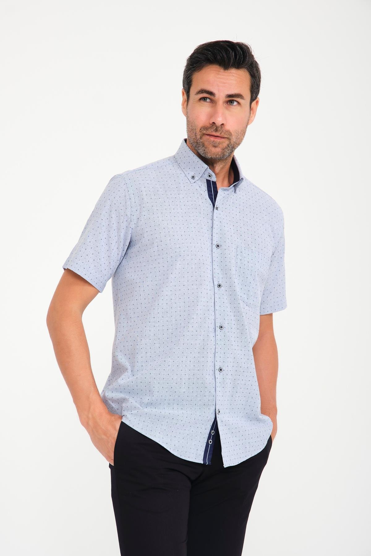 Klasik Kısa Kol Çarpı Filafil Desen Düğmeli Yaka Hediye Kutulu Erkek Gömlek FS-001215 - Lacivert (FS-001215)
