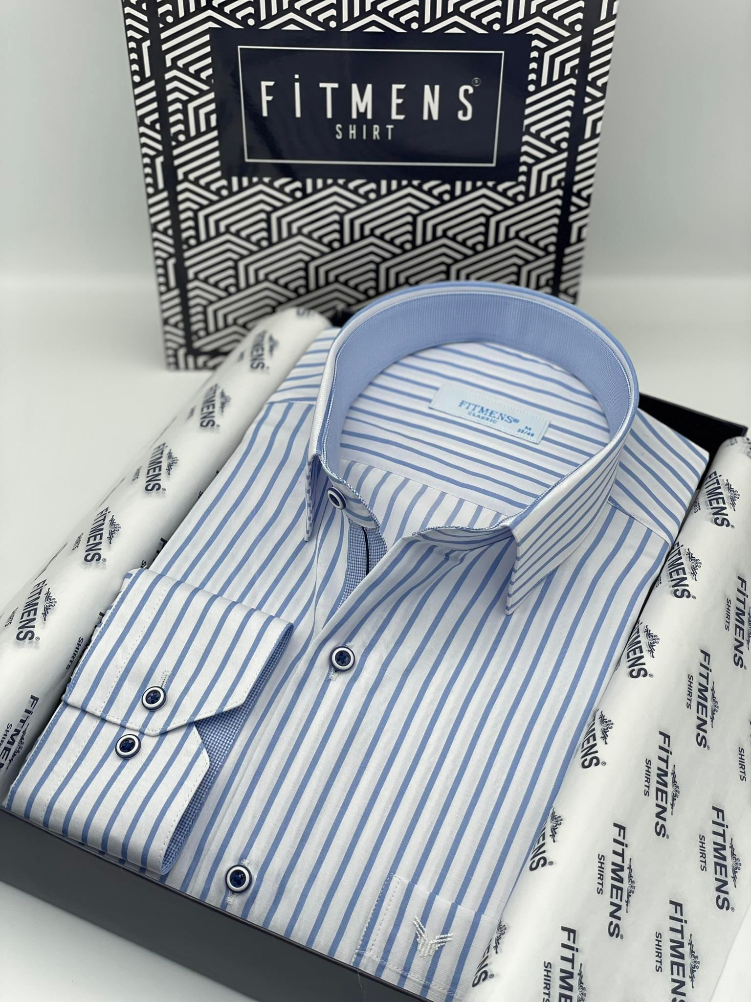 Klasik Uzun Kol Kalın Çizgili Hediye Kutulu Erkek Gömlek FS-001260 - Beyaz Açık Mavi (FS-001260)