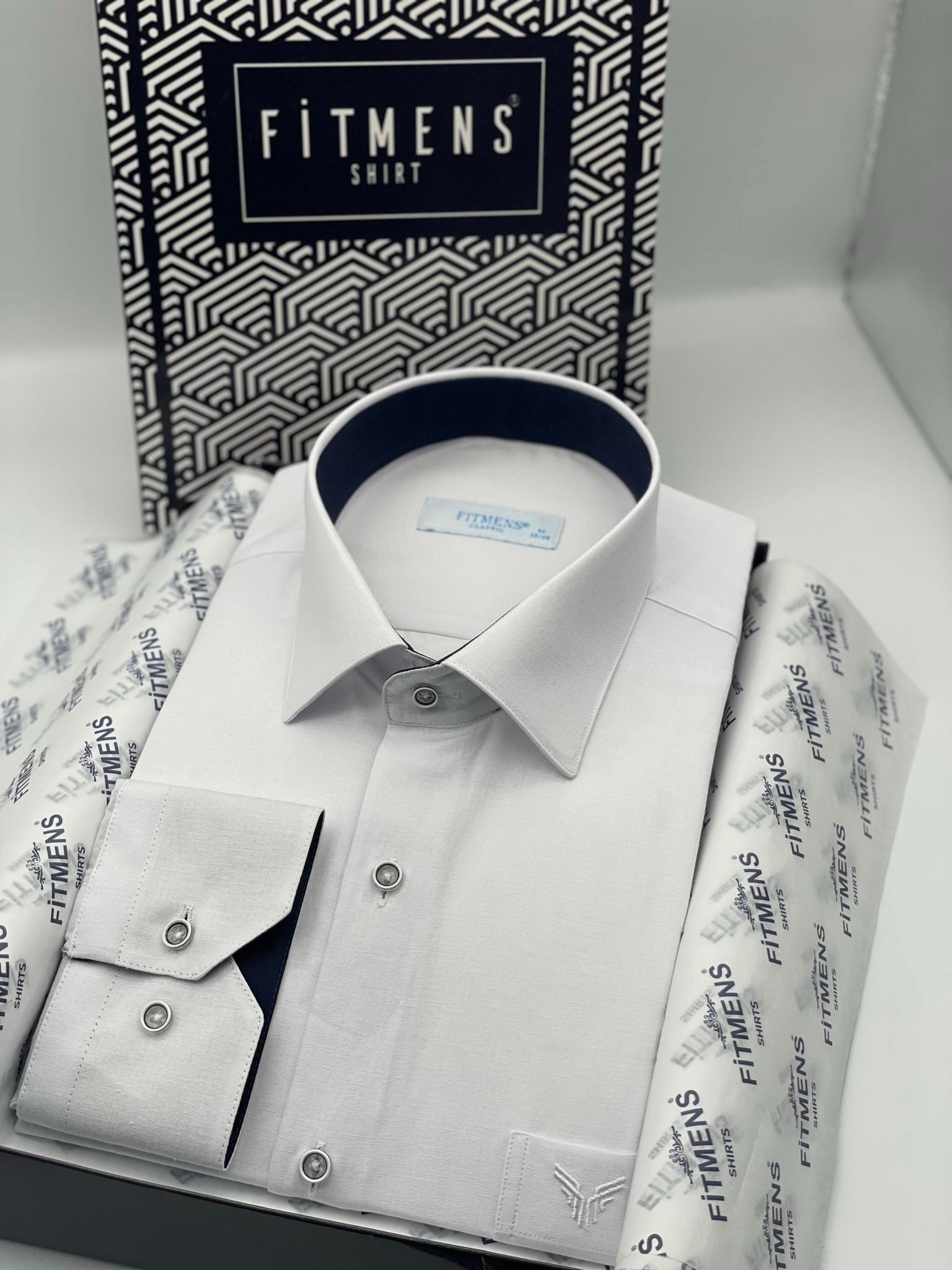 Klasik Uzun Kol Keten Cotton Hediye Kutulu Erkek Gömlek FS-001261 - Beyaz Lacivert (FS-001261)