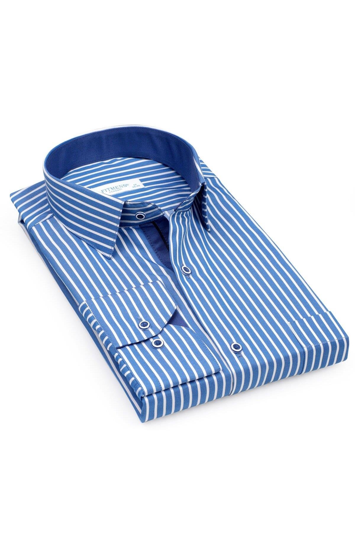 Klasik Uzun Kol Premium Kalın Çizgili Hediye Kutulu Erkek Gömlek FS-001266 - Saks Mavi Beyaz (FS-001266)