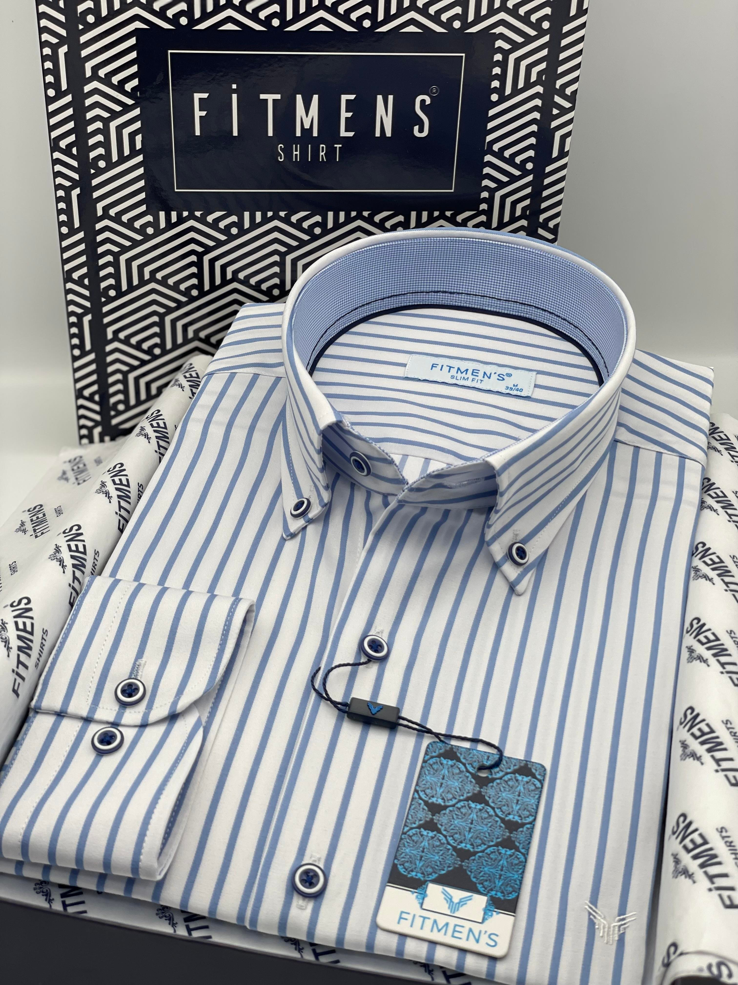 Slim Fit Uzun Kol Premium Kalın Çizgili Yaka Düğmeli Hediye Kutulu Kolay Ütülenebilir Erkek Gömlek FS-001375 - Beyaz Açık Mavi (FS-001375)