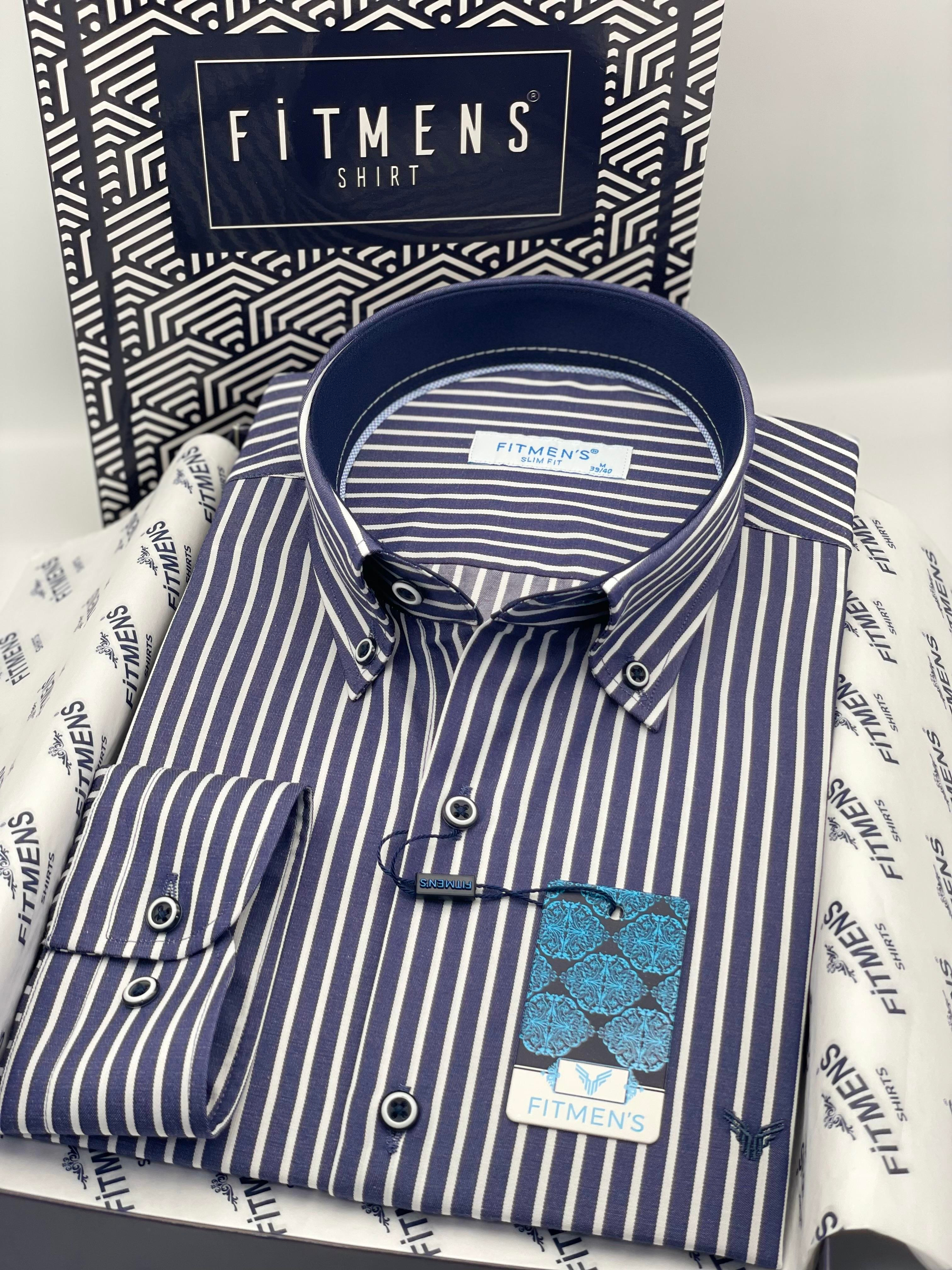 Slim Fit Uzun Kol Premium Kalın Çizgili Yaka Düğmeli Hediye Kutulu Kolay Ütülenebilir Erkek Gömlek FS-001375 - Lacivert (FS-001375)