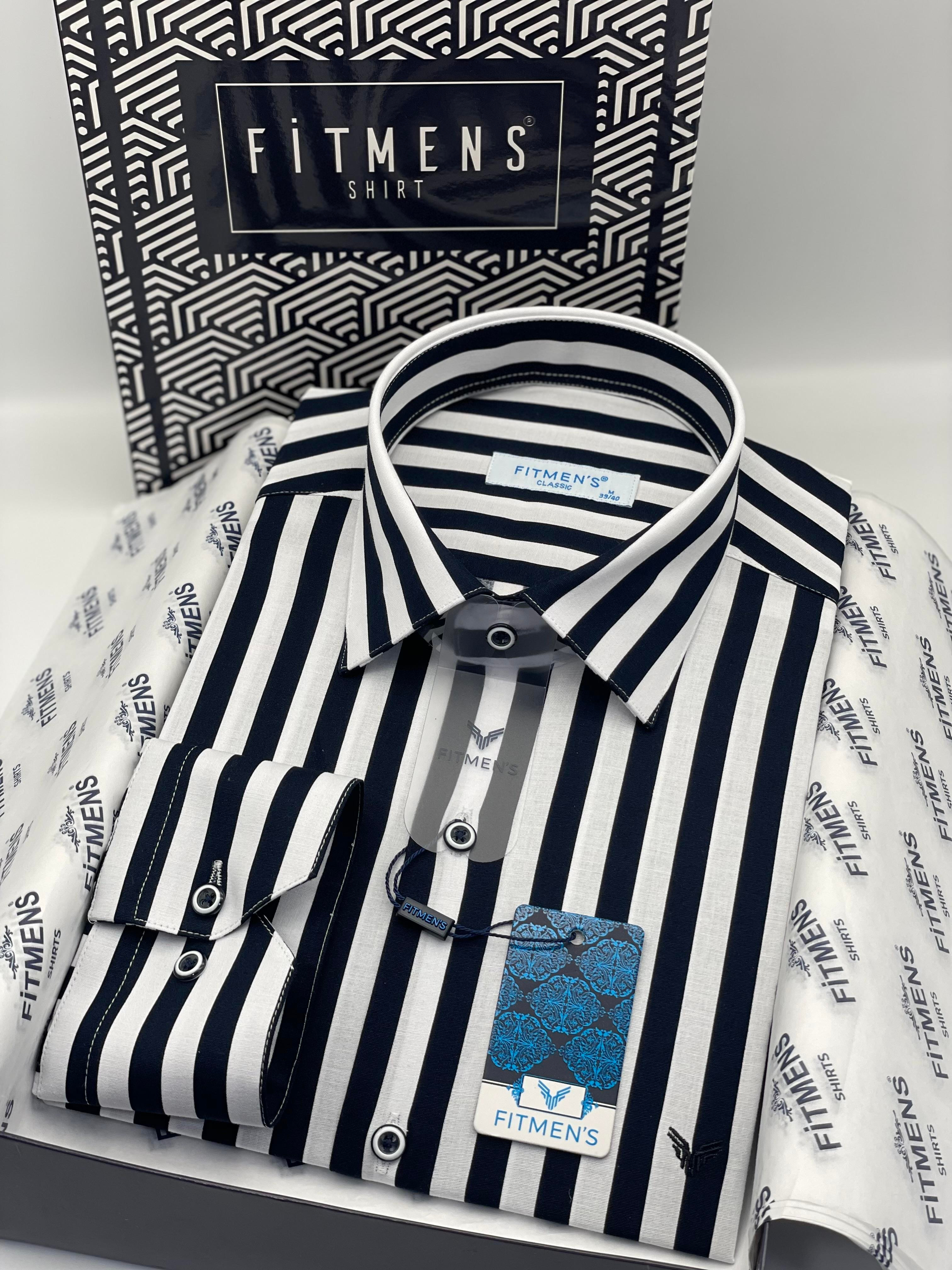 Klasik Uzun Kol Çizgili Cepsiz Yaka Alttan Düğmeli Likralı Hediye Kutulu Erkek Gömlek FS-003175 - Lacivert Beyaz (FS-003175)
