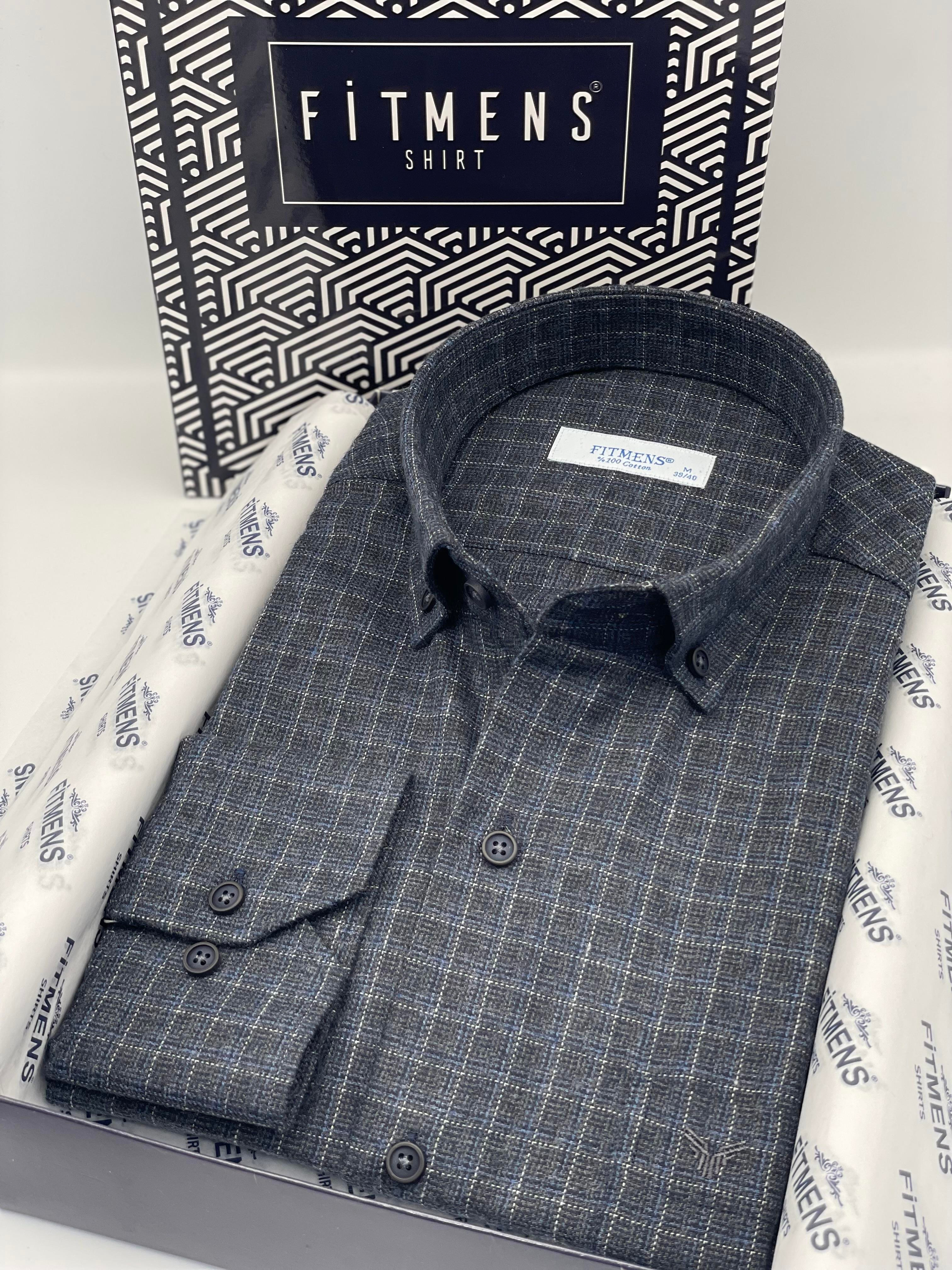 Klasik Uzun Kol Kışlık Ekoseli Yaka Düğmeli %100 Cotton Hediye Kutulu Erkek Gömlek FS-003767 - Lacivert (FS-003767)
