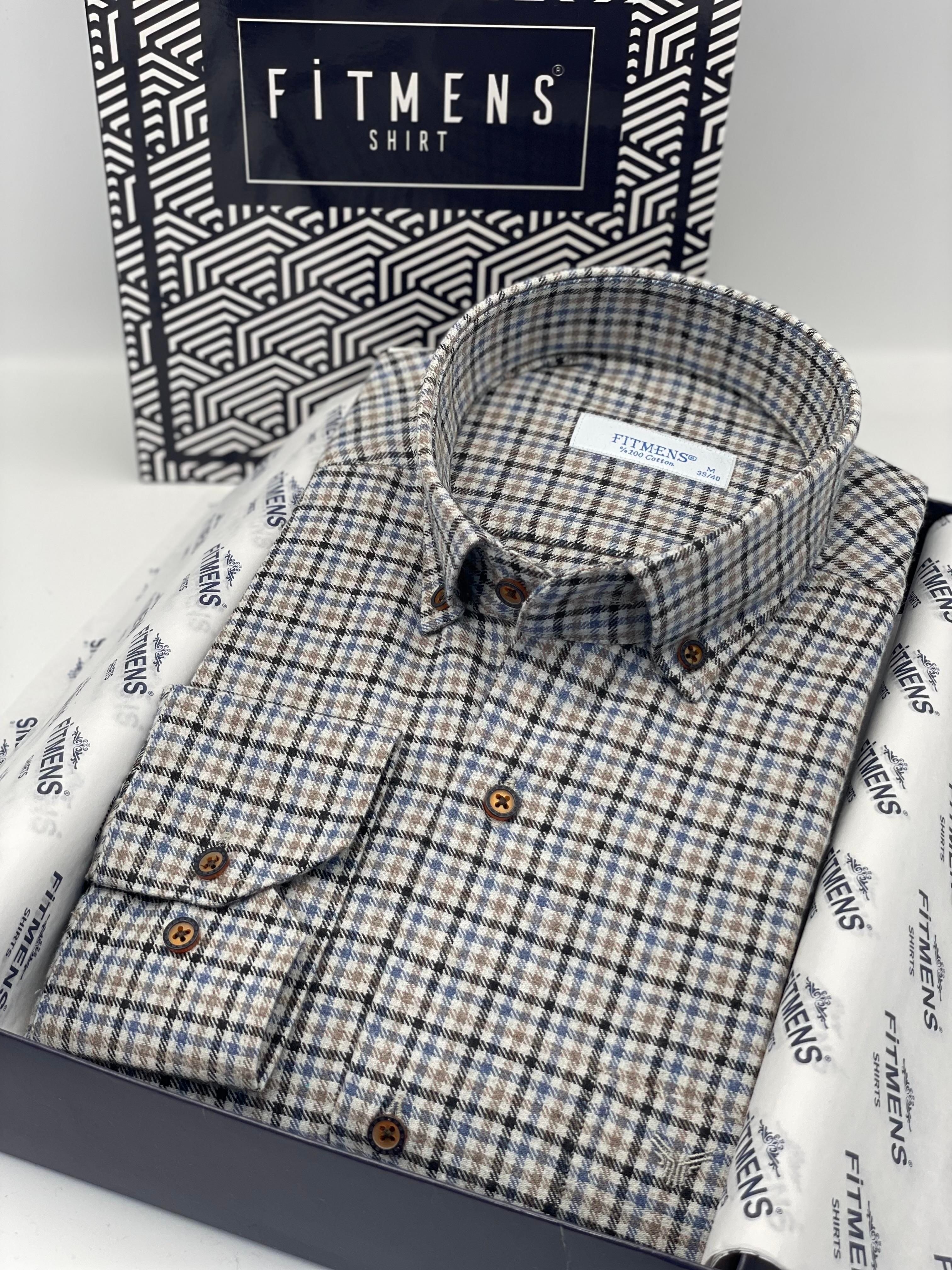 Klasik Uzun Kol Kışlık Ekoseli Yaka Düğmeli %100 Cotton Hediye Kutulu Erkek Gömlek FS-003765 - Bej (FS-003765)