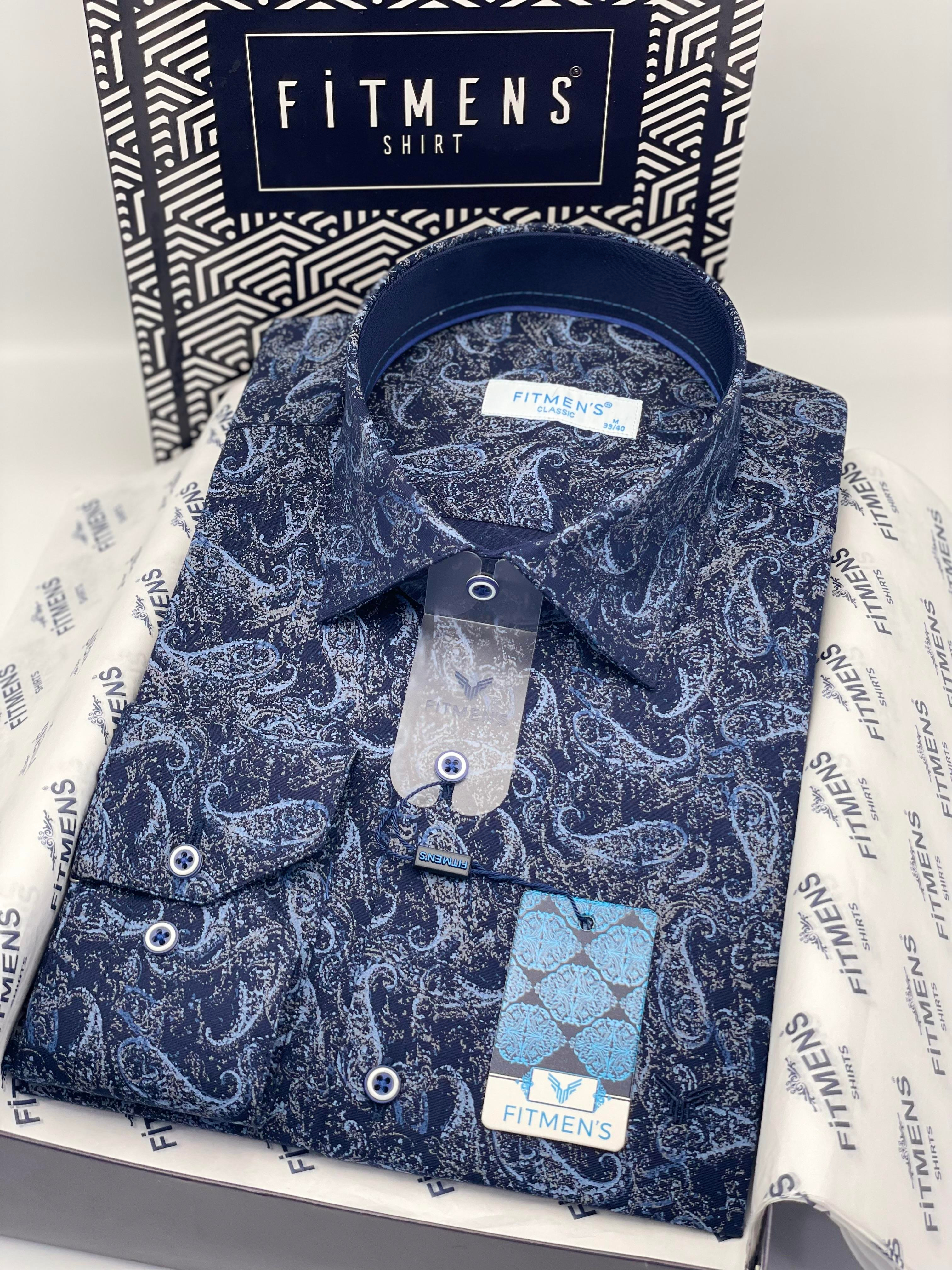 Klasik Uzun Kol Likralı Cepsiz Şal Desen Yaka Alttan Düğmeli Hediye Kutulu Erkek Gömlek FS-003668 - Lacivert (FS-003668)
