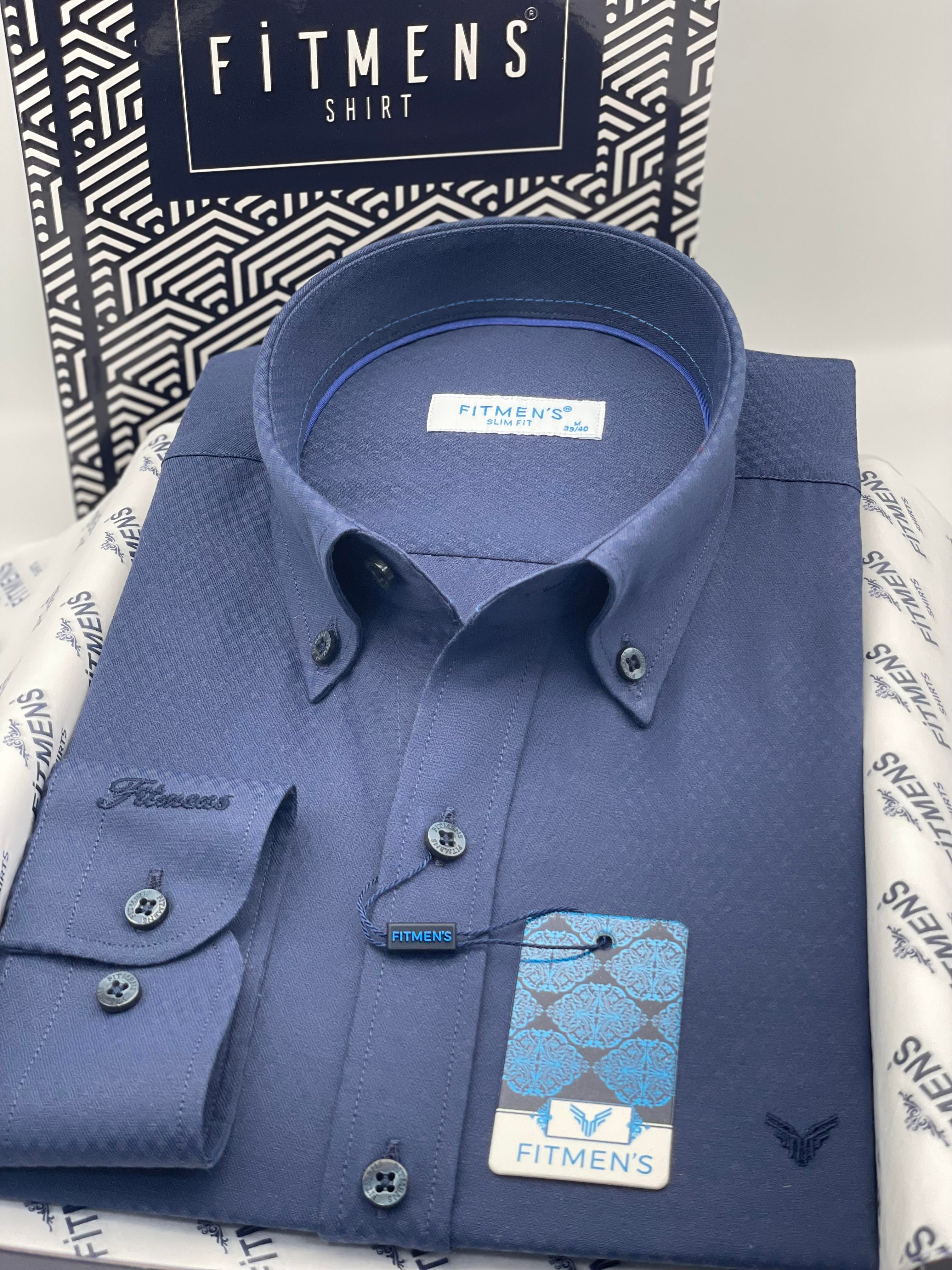 Slim Fit Uzun Kol Baklava Desen Kol Nakışlı Yaka Düğmeli Hediye Kutulu Şık Erkek Gömlek FS-004200 - Lacivert (FS-004200)