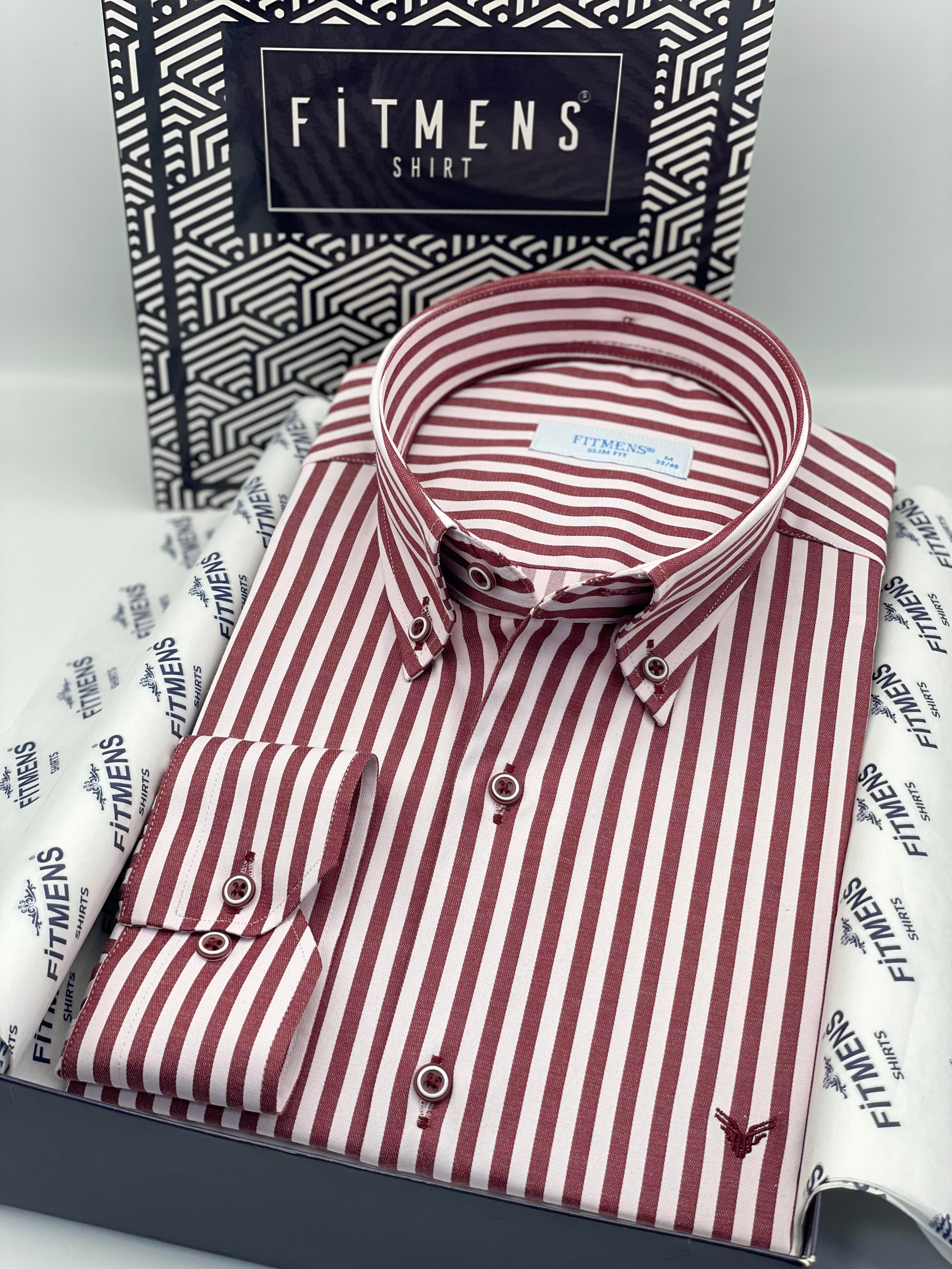 Slim Fit Uzun Kol Likralı Çizgili Yaka Düğmeli Hediye Kutulu Erkek Gömlek FS-003669 - Bordo (FS-003669)