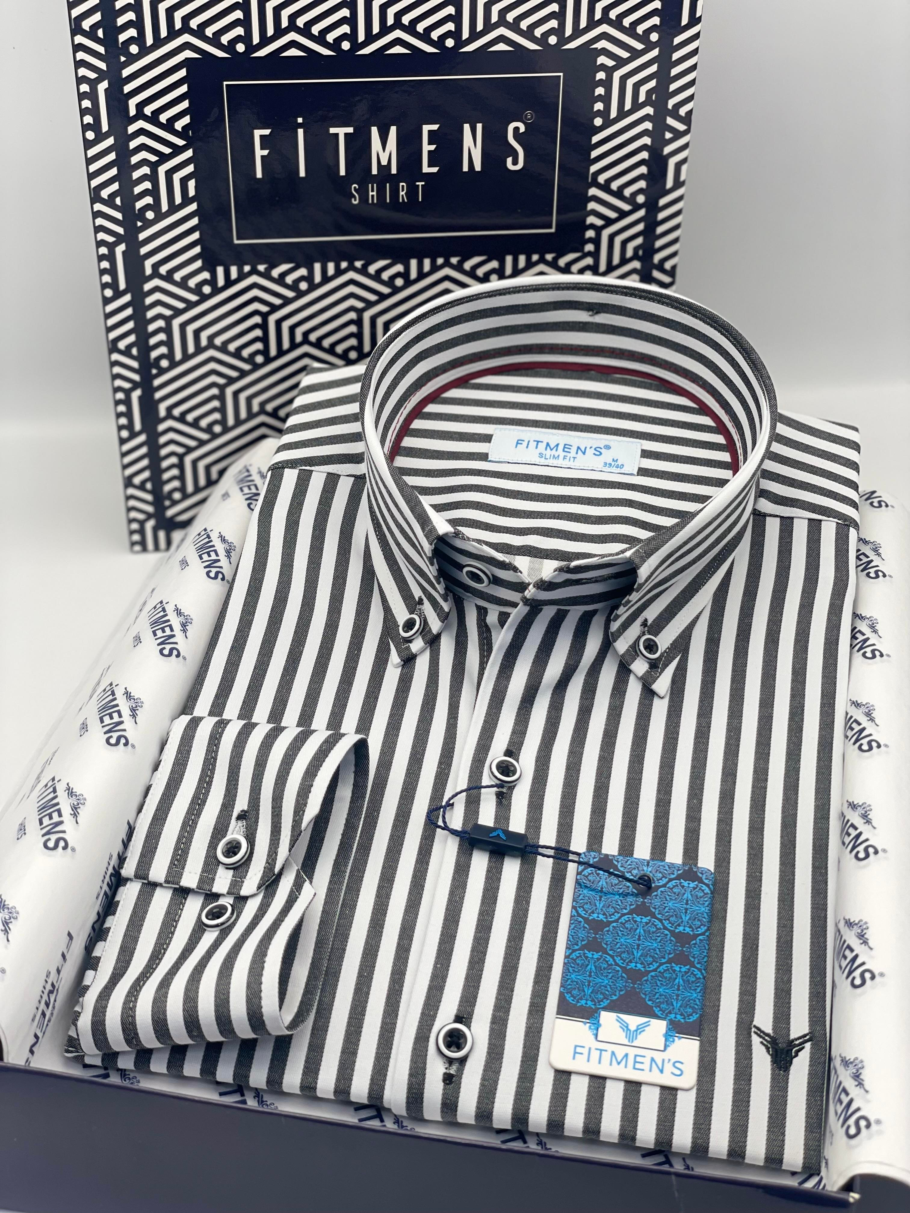 Slim Fit Uzun Kol Likralı Çizgili Yaka Düğmeli Hediye Kutulu Erkek Gömlek FS-003669 - Koyu Gri (FS-003669)